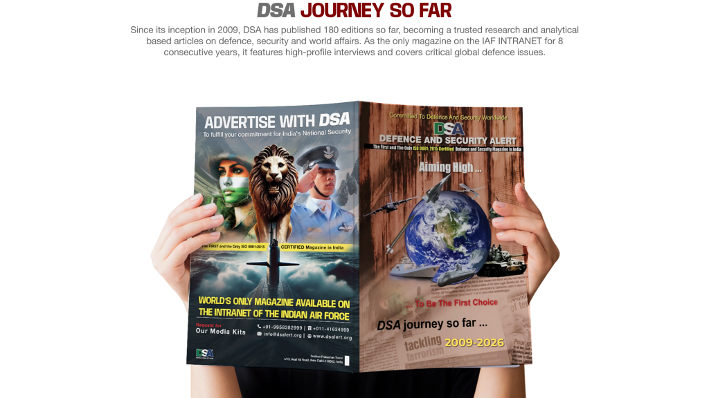 Defence and Security Alert (DSA) , established in 2009 post 26/11 Mumbai attack, aimed to provide comprehensive analysis on defence, security and international affairs. Initially India-focused, it swiftly expanded to address global challenges. The magazine features insightful articles from top experts worldwide, discussing threats and solutions for a secure world. (DSA) holds the prestigious ISO 9001:2015 Certification and has been uniquely featured on the Indian Air Force (IAF) INTRANET for eight consecutive years, reinforcing its credibility in the defence, security and international affairs domain.